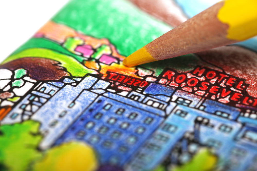 While doing some research (i.e. clicking around the web) the artwork of Steve McDonald, and specifically his series of best-selling adult coloring books depicting real-life and imaginary city scenes were stumbled upon. After reaching out to Steve and one thing led to another, there was a selection of four attractive American cities, and were able to find a view of each that suited his illustration style, bounced a few sketches back and forth, and set him to work. Meanwhile, compiled useful (and not-so-useful) information about the four cities, and tested a variety of media on several paper stocks. The result is our 58th Quarterly Edition: “Streetscapes.”